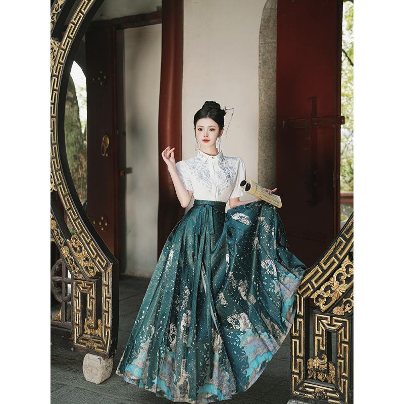 This exquisite clothing set features a short-sleeved top and a gradient dark green horse-face skirt, offering a modern take on traditional Chinese attire. Crafted from soft and breathable cotton, both pieces ensure comfort and durability for any occasion. The top is adorned with elegant floral embroidery, adding a touch of sophistication and cultural charm. This set beautifully blends timeless style with contemporary aesthetics, making it a perfect choice for those who appreciate fashion with a cultural heritage.