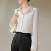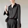 Gray-Blue Satin Women's Long-Sleeve Shirt - Retro Hong Kong Style, Three-Color Spot, Versatile Spring Fashion with Dark Placket and Elegant Drape.
