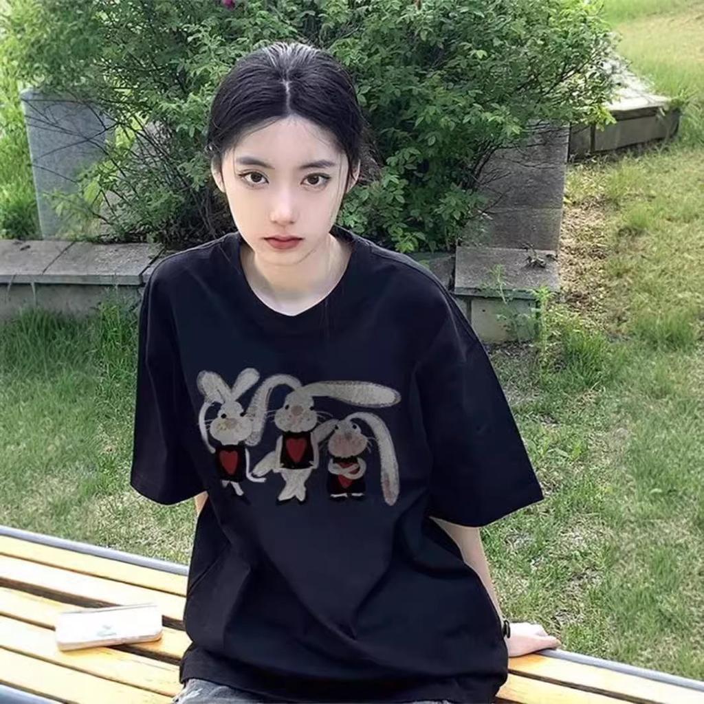 This stylish oversized tee is crafted from soft cotton material, offering both comfort and a trendy look. It features a bold black rabbit print that adds a playful touch to your outfit. Designed with a short sleeve length and a classic round neckline, this tee is perfect for casual wear and easy to pair with your favorite jeans or shorts. Whether you're lounging at home or out for a casual day, this tee ensures you stay comfortable and chic.