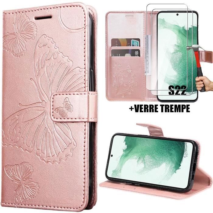 Coque - PROSHOP - pour Samsung Galaxy S22 - Cuir Synthétique - Élégante - Rose - 2 Verres trempés