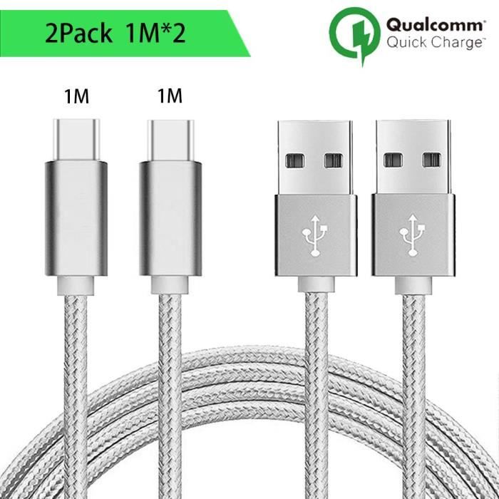 USB Type C Cables - Samsung - Galaxy S8/S9/S10 - 1M - Silver Nylon - Compatible Huawei/Xiaomi