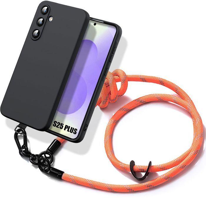 Coque pour Samsung Galaxy S25 Plus (S25+) Silicone Antichoc Noir avec Cordon Détachable Orange