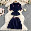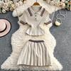 Summer Women College Style Knitted Sweater Two Piece Set Girl Polo Collar Pullover Top and Mini Pleated Skirt Suit