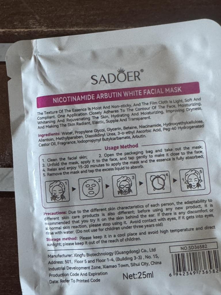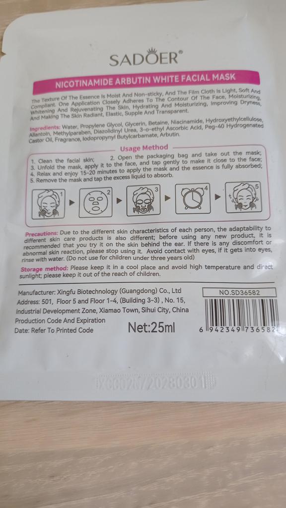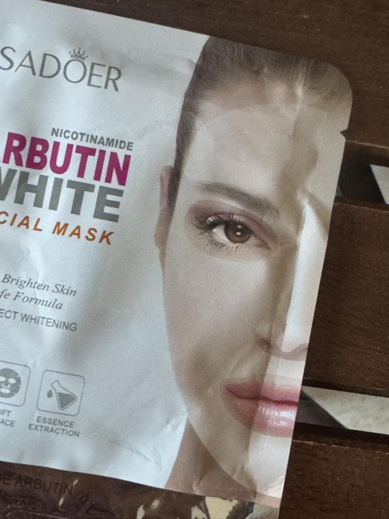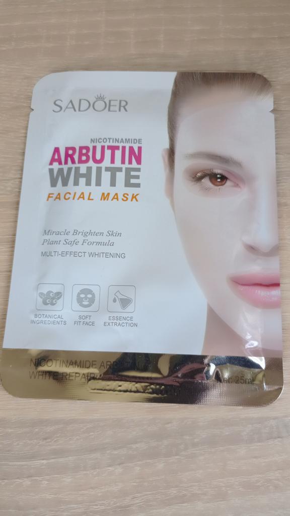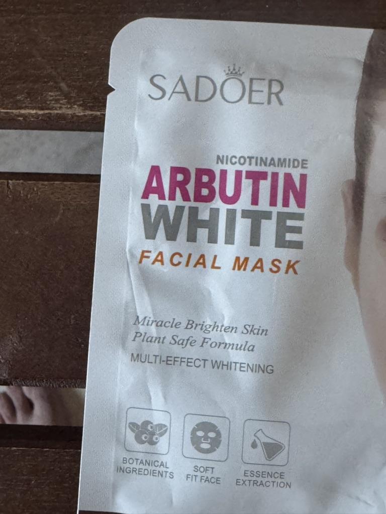 whitening fabric face mask SADOER Nicotinamide Arbutin White Facial Mask. Purpose: The mask is designed to brighten the skin, even out the tone, moisturize and rejuvenate. Main Ingredients: Contains niacinamide and arbutin, known for their brightening properties. Mode of application: Apply the mask to cleansed face, leave on for 15-20 minutes, then remove and allow the remaining essence to absorb. I recommend.👍