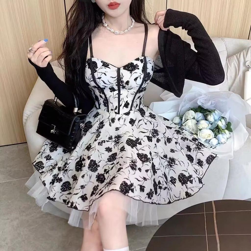Women French Floral Suspender Mesh Dress Summer Vintage Elegant Dresses