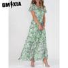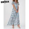 GMXIA 6 Color V-neck Ruffle Maxi Dress Short Sleeves Fitted Waist High Waist Flowy Hem Cute Floral Chiffon Dress Women Clothing