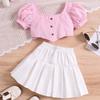 Girls' Fashion Set: Summer Children's Checkered Flared Sleeve Square Neck Pullover, Solid Color Patchwork Pleated Skirt Two-piece Set