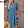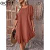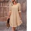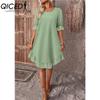 QICED Women's Fashion Summer Spring Solid Color Print O-Neck High Waist Casual Dresses