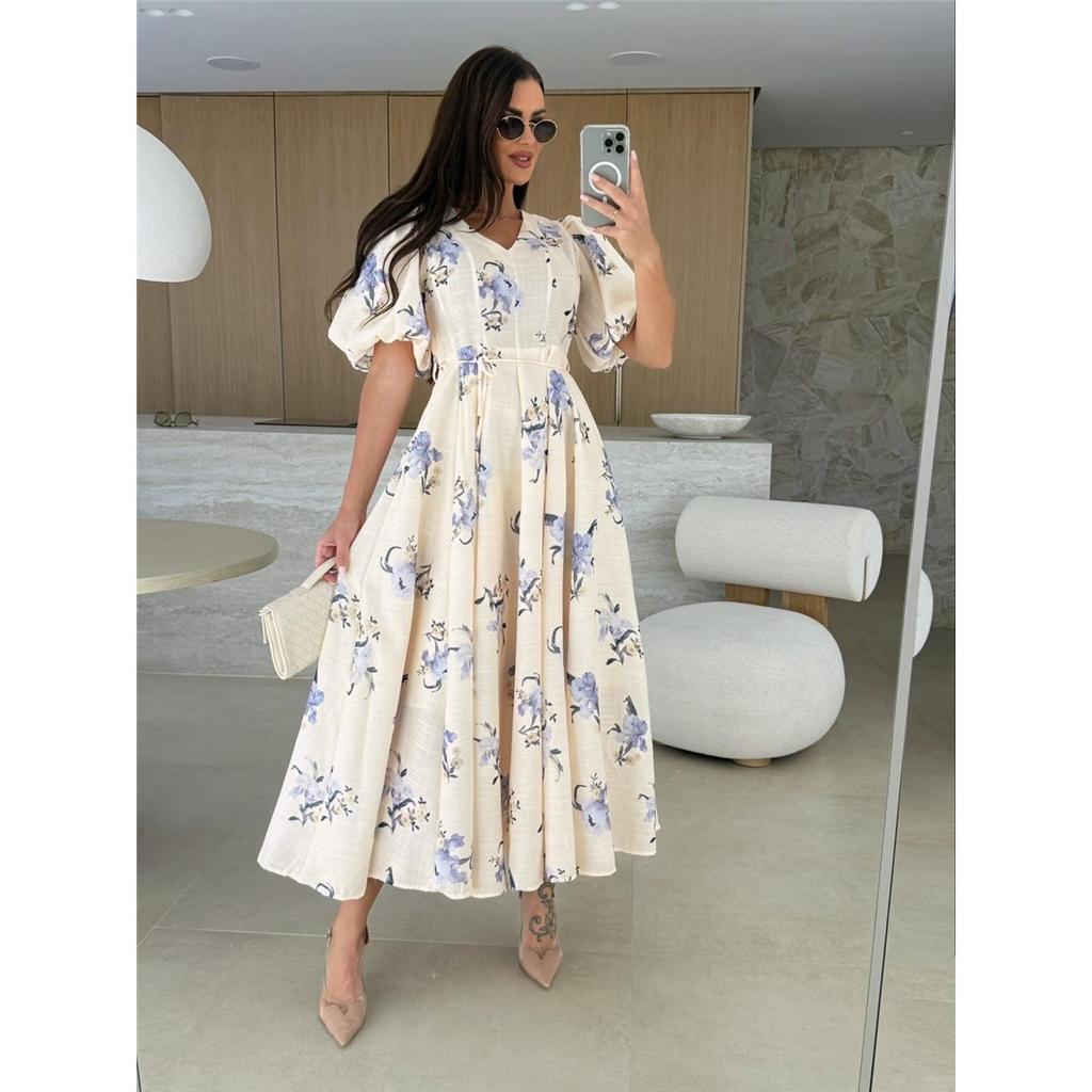 Summer New Women's Short Sleeve Printed Dresses Tie Waist Large Swing Dresses