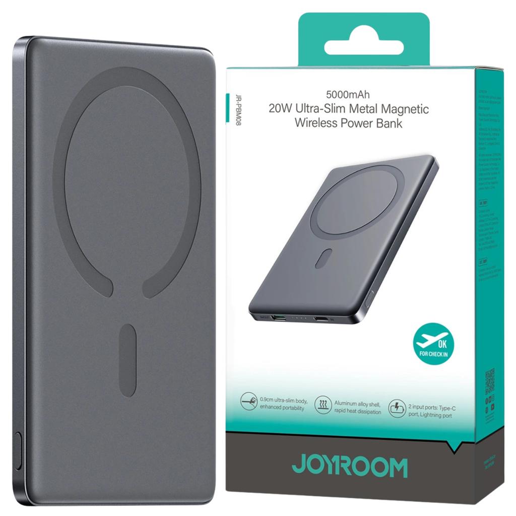 ManufacturerJoyroomModelJR-PBM08Full name20W Ultra-thin Metal Magnetic Wireless Power Bank 5000mAhBatteryLithium-polymerBattery capacity5000 mAh 3.85 V (19.25 Wh)Nominal capacity3000 mAh (5 V = 2,4 A)Input power Lightning5 V = 2.4 A (12 In)Input power type C5 V = 3 A, 9 V = 2 A (18 In)Type C5 Output Power V = 2.4 A, 9 V = 2.22 A, 12 V = 1.67 A (20 W)Wireless charging output power5 W/7,5 W/10 W/15 W (max.)Multi-port output power5 V = 3 A (max.)Size102 x 67 x 9.2 mm Material of construction fire-retardant material PC + ABSWeight120g