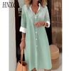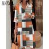 HNXC Women Fashion Spring Autumn Color Block Print Long Sleeve Polo Collar Loose Waist Casual Dresses