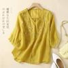 V-neck Five-quarter-sleeved Embroidered Cotton and Linen Shirt for Women's 2025 Summer New Thin Top with Loose Temperament and Beautiful Shirt