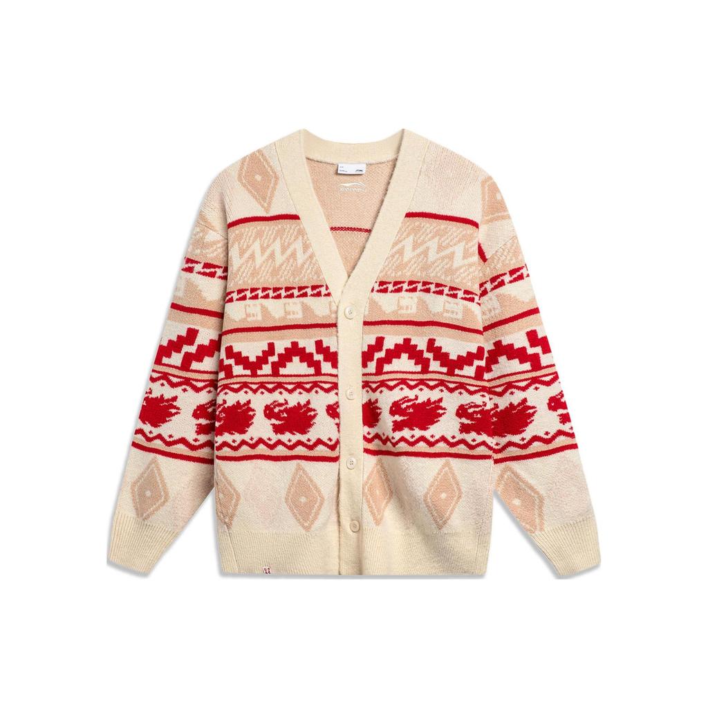 Li Ning Daily Prosperity Series All Over Print Embroidered V Neck Knitted Sweater Single Breasted Long Sleeve Knitwear Men Sweater Off-White AMBU021-1