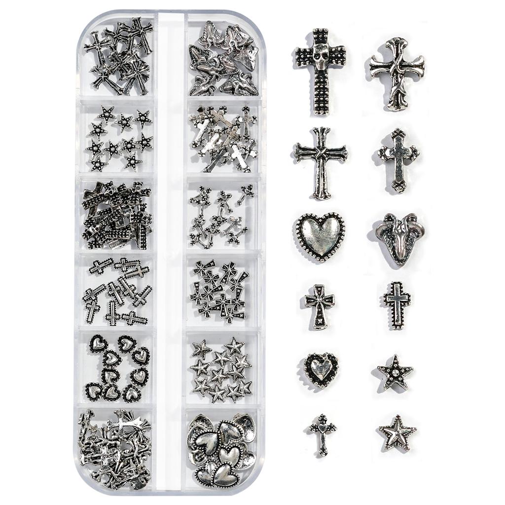 1/3Boxed 12 Grids Vintage Cross Shaped Zinc Alloy Jewelry Nails Supplies Heart&Star Shaped Metal Y2k Nail Art Decoration