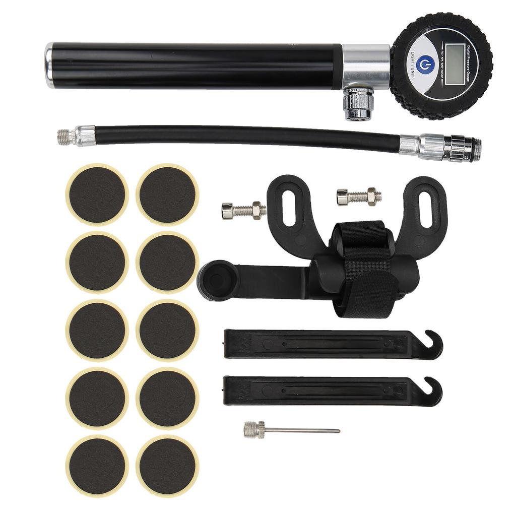 1 x Digital Display Pump1 x Extension Hose1 x Install Clip Set1 x Nozzle2 x Pry Bar10 x Glueless PatchEasy to carry, you can put it in a bicycle bag, or you can install it on a bicycle using only a bicycle stand.