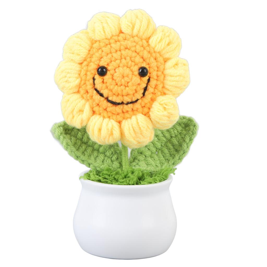 1. CUTE DESIGN: The smile face crochet sunflower flower with pot is made of quality knitted wool and plastic material, cute and soft. Its bright colors make it a great addition to home, office or desk decoration
