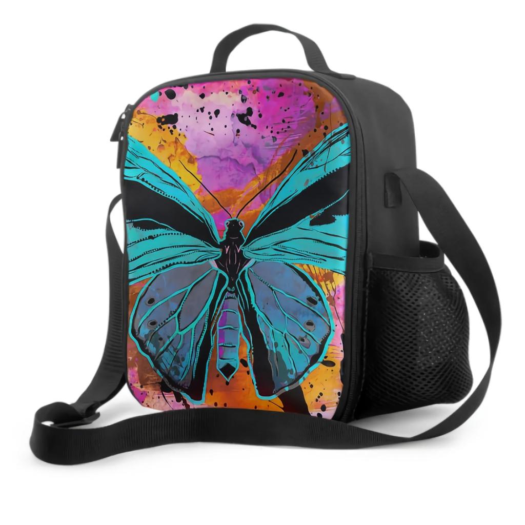 Oil Painting Blue Butterfly Insulated Thermal Lunch Bags for Boys Girls Washable Tote Lunch Food Container for School Travel