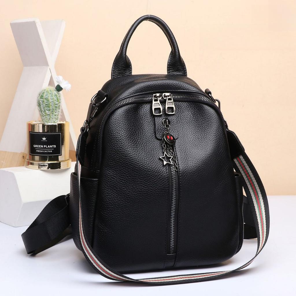 - This backpack showcases a sleek and modern design. It is crafted from leather, featuring a textured pebbled finish that adds a touch of luxury. The black color gives it a classic and versatile look, suitable for various styles. The backpack is equipped with multiple zippered compartments, including a large main compartment with dual - zipper pulls and a front pocket for easy access to essentials. The shoulder straps are adorned with colorful striped details, adding a trendy and vibrant element to the overall design.