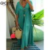 QICED Women's Fashion Summer Spring Solid Color Print Short Sleeve V-Neck High Waist Casual Dresses