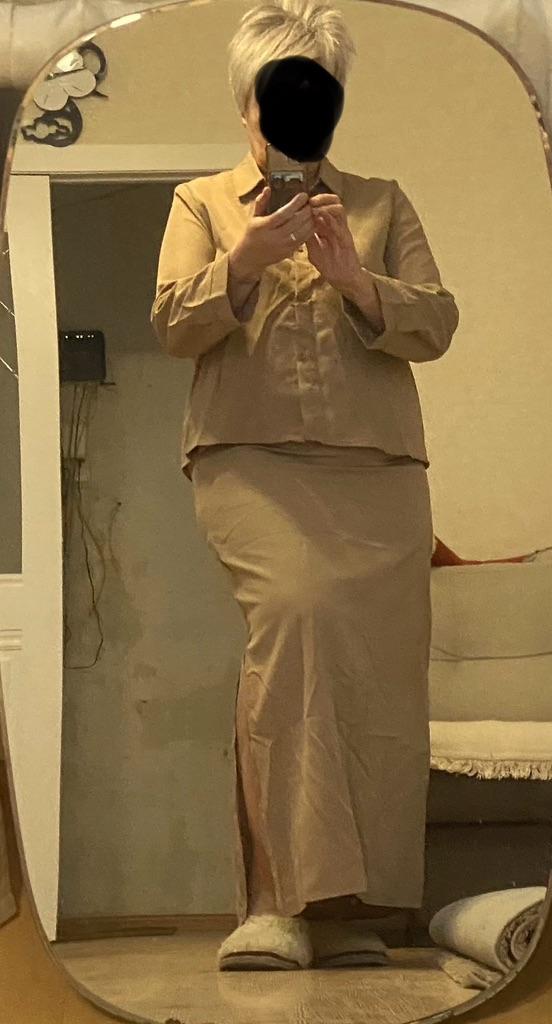Wrong size, small😩 Model on heels, skirt long, color matches, beautiful, fabric polyester doesn't stretch, fabric