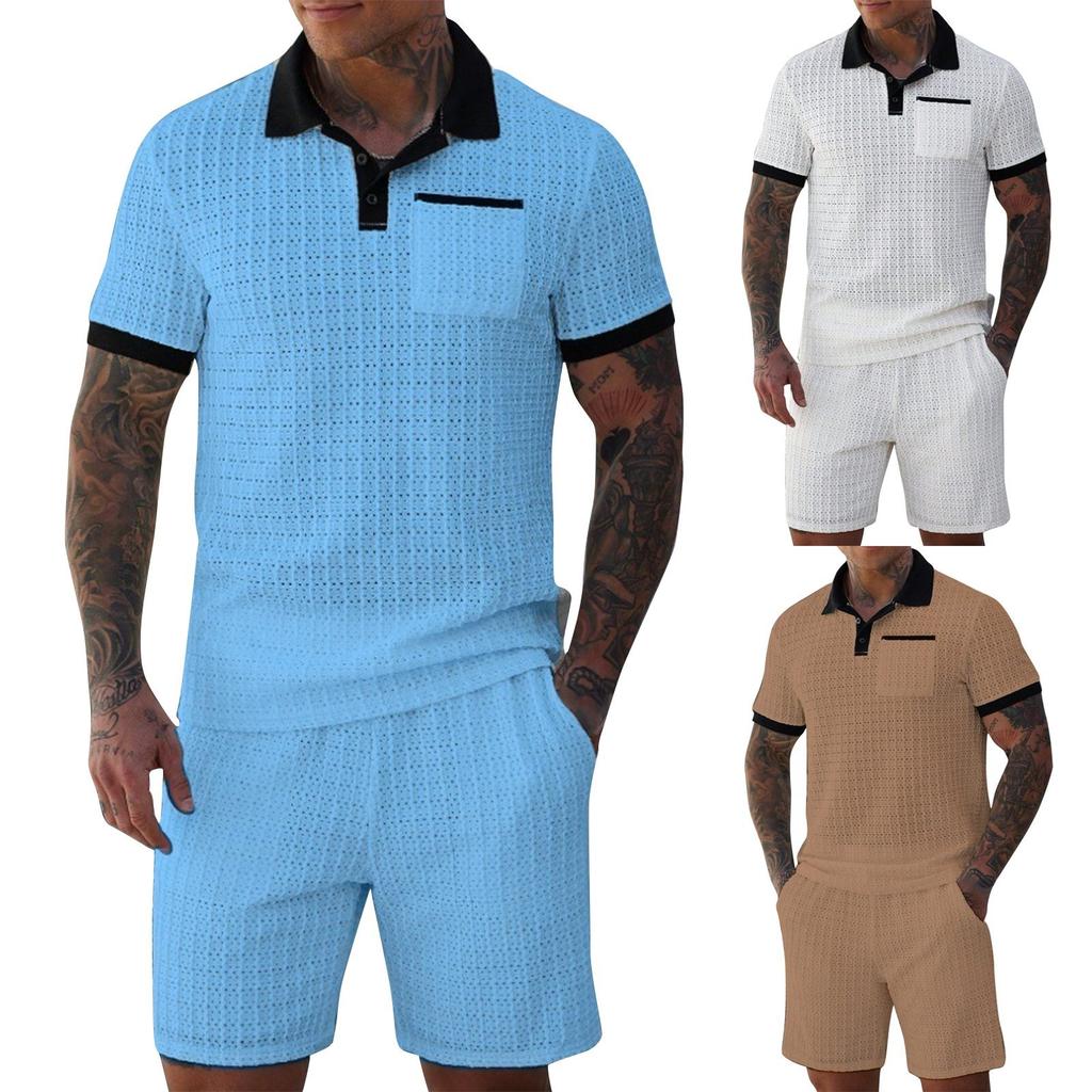 Men's Summer Solid Color Hollow Texture Button Collar Shirt Top Shorts Set