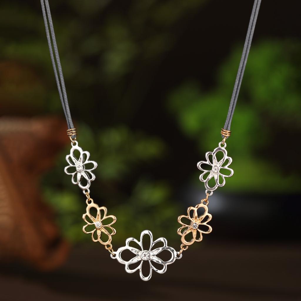 New Hollow Geometric Diamond-encrusted Flower Necklace, Women's Simple and High-end Two-color Flower Leather Rope Necklace