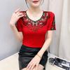 Summer Lace Hot Diamonds Embroidery Flower Designer T-Shirt Elastic Sexy O-Neck Slim Mesh Tops Chic Women's Short Sleeved Vintage Tees Blouse