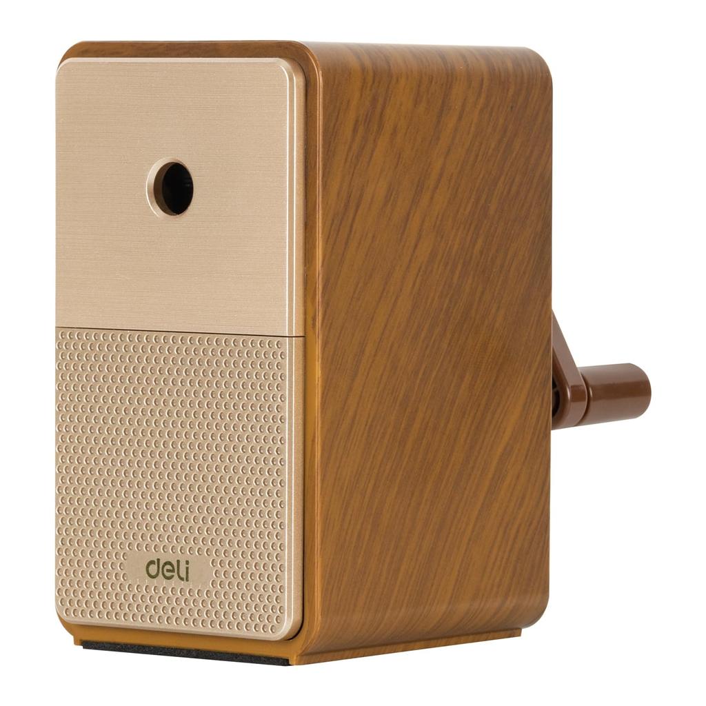 Deli Manual Pencil Sharpener Mini Wood Grain Brown Broken Lead Remover 5 Level Lead Adjustment Automatic Pen Feed Compatible with Various Pencils