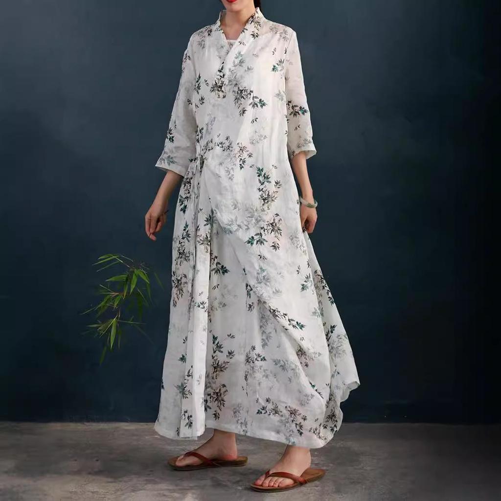 Mountain Spirit Sheer Flowy Tie-Waist Long Dress with Irregular Neckline, Women's Ramie Tea Dress
