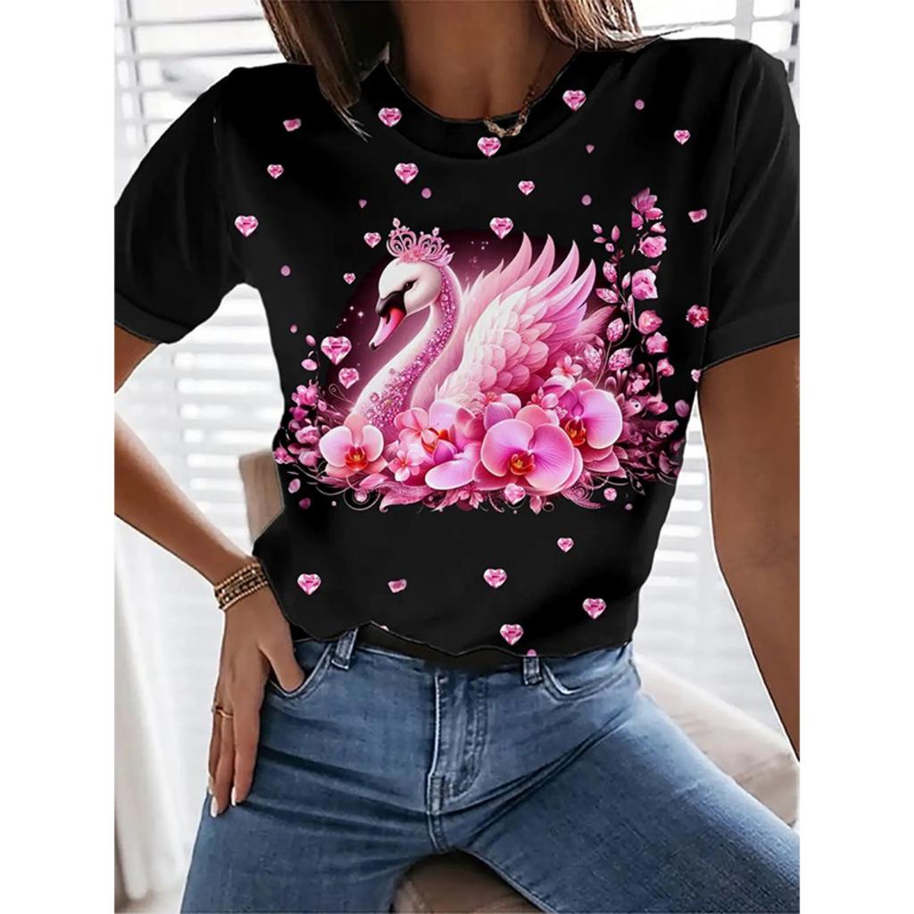 Summer Swan Butterfly T-shirt Flower 3D Printed Women's Casual Round Neck Short Sleeve T-shirt Harajuku T-shirt Women's Top