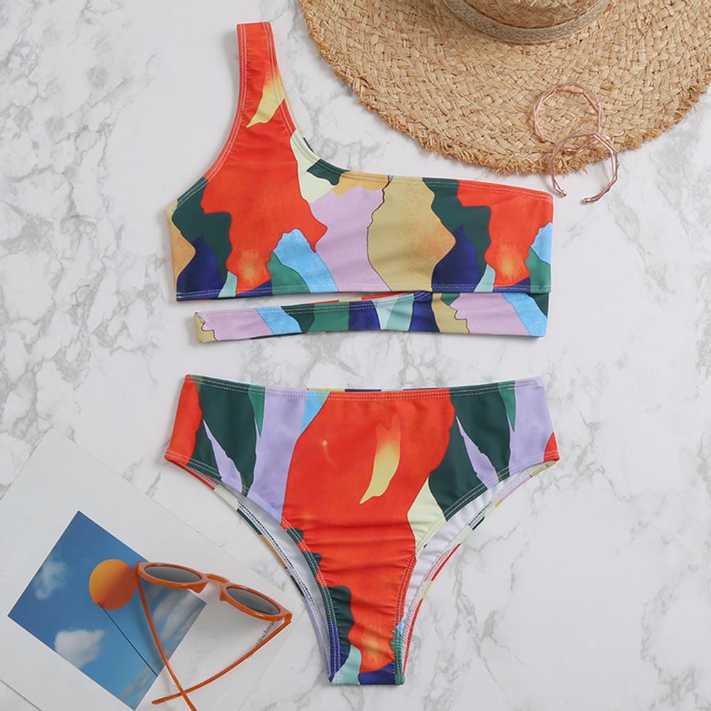 Women Split Swimsuit One Shoulder Print Beach Bikini Suit Swimsuit Beachwear