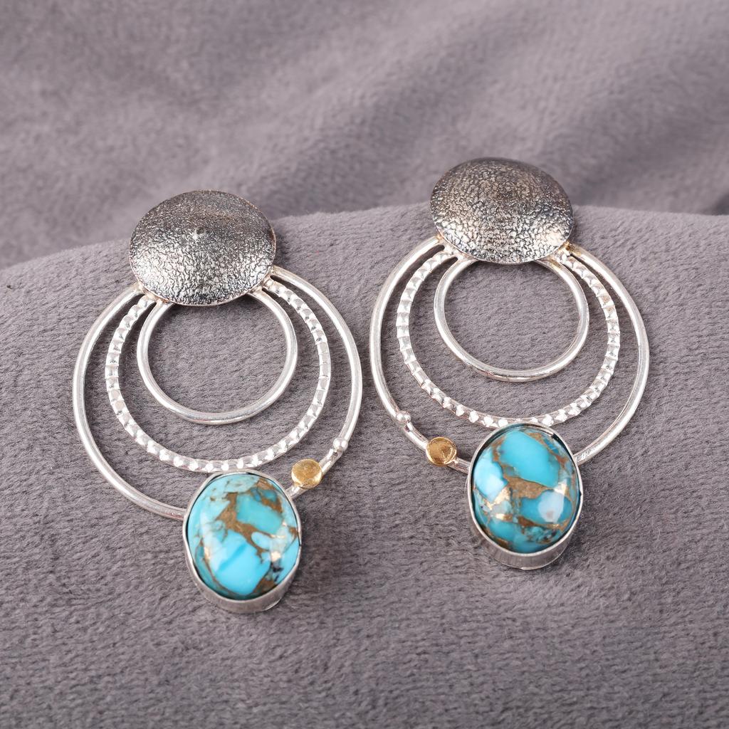Blue Copper Turquoise Handmade Gemstone Earrings, 925 Solid Sterling Silver Earrings Antique Jewelry, For Engagement Gift