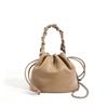 This bag has a stylish, drawstring - style bucket silhouette crafted from top - layer cowhide leather. It features a soft, textured surface, a unique metal chain - decorated handle, a drawstring opening, and an adjustable/detachable chain strap, creating a fashionable and chic look.