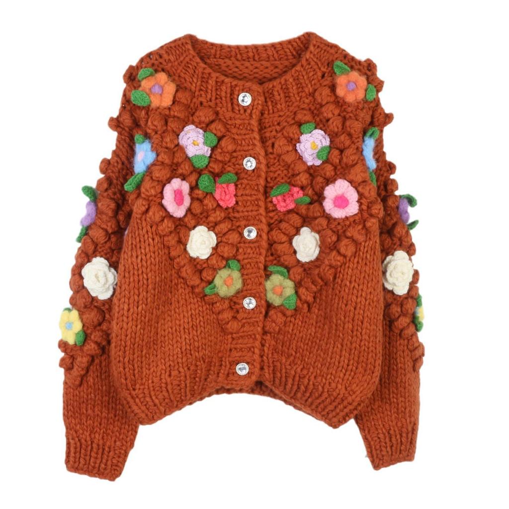 Women's Floral Round Neck Long Sleeve Cable Knit Cardigan