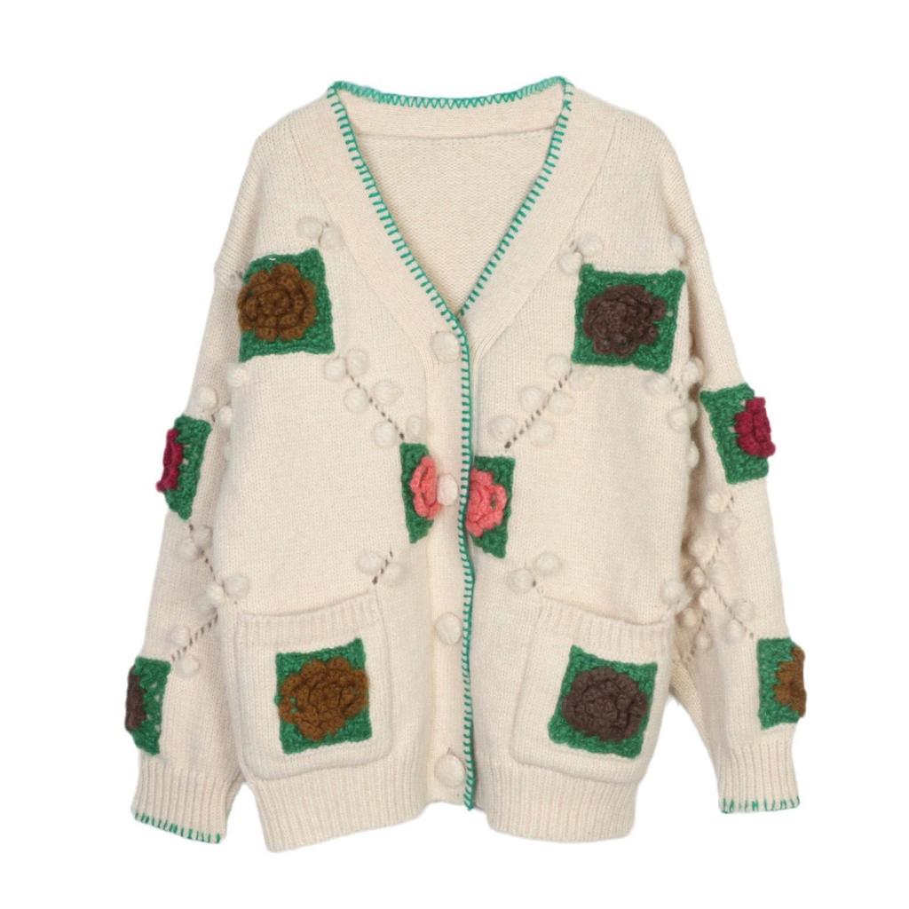 European & American Color-Block V-Neck Hand-Crocheted Loose Knit Cardigan – Autumn/Winter Style