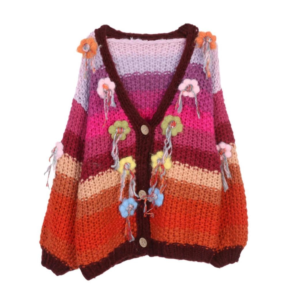 Women's V-Neck Striped Flower Crochet Cardigan - Long-Sleeve, Loose Fit, Perfect for Autumn & Winter.