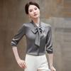 Elevate your workwear collection with this elegant and versatile long sleeve shirt. Crafted from high-quality polyester, it offers a smooth and drapey fit that flatters any silhouette. The solid pattern and quilted patchwork details provide a sophisticated touch, perfect for professional settings. Featuring a chic V-neckline adorned with a stylish ribbon, this shirt is ideal for the spring and autumn seasons. Its timeless design ensures it pairs effortlessly with various outfits, making it a must-have addition to your wardrobe.