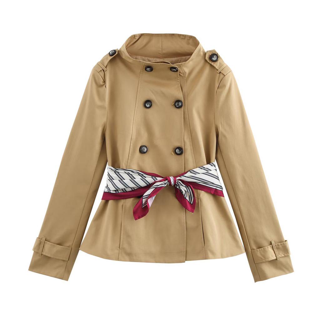 Discover the epitome of elegance with this Women's European & American Style Fashion Print Short Trench Coat. Thoughtfully crafted from high-quality polyester, this chic trench coat is designed for modern women seeking a sophisticated look. The coat features a sleek stand neckline and long sleeves, perfectly complementing its stylish design. A unique scarf detail adds a touch of flair, making it an ideal choice for elevating any outfit. Whether you're attending a social gathering or stepping out for a casual stroll, this trench coat is sure to make a statement in your wardrobe.