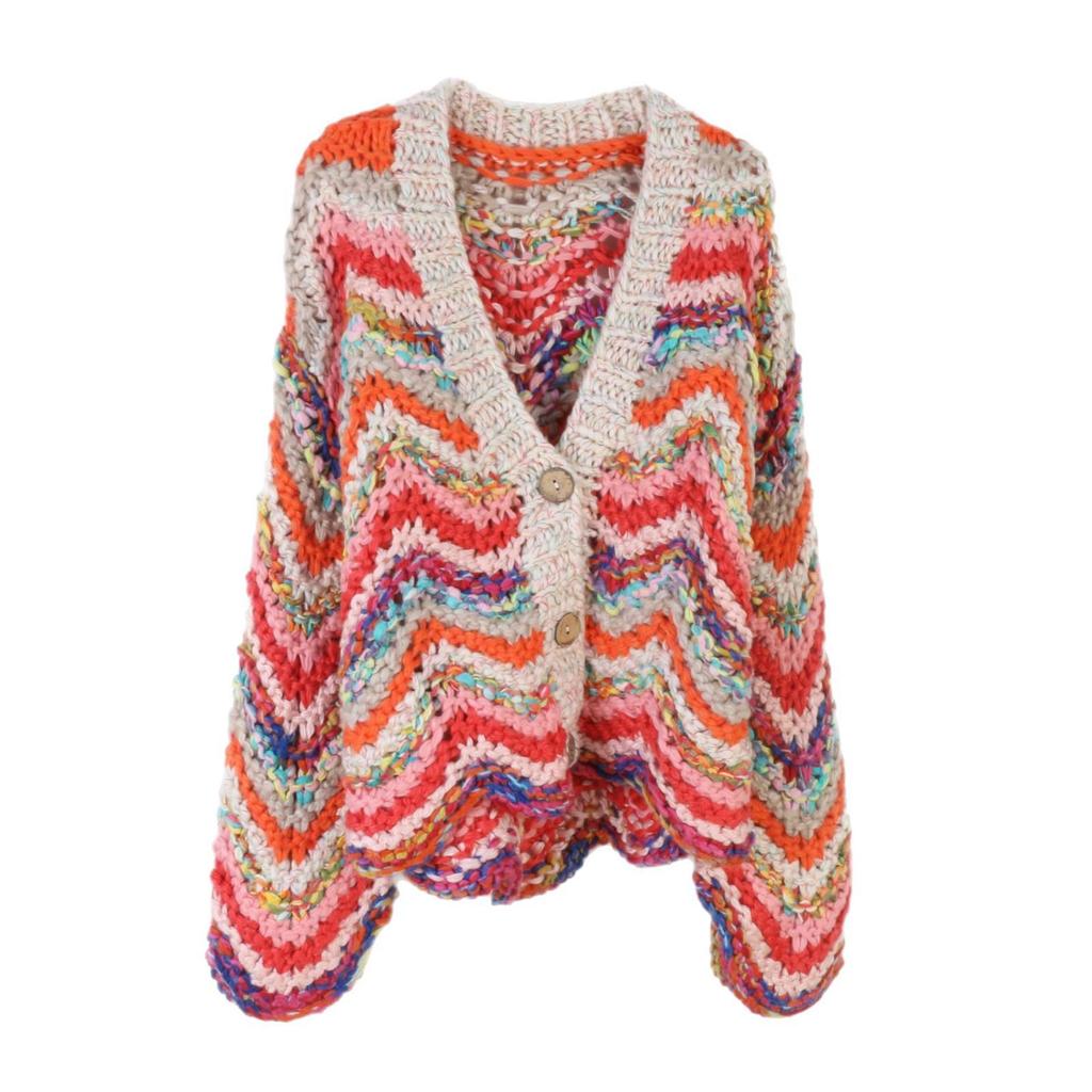 19370 Thick Knit Colorful Wave Pattern CardiganSize