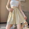 Discover ultimate comfort and style with these women's high-waist A-line casual shorts. Crafted from cool ice silk and polyester, these shorts offer a luxurious and breathable feel, perfect for warm weather. The fashion-forward design and high-waist silhouette ensure a flattering fit, making these shorts a versatile addition to any wardrobe. Ideal for casual outings or relaxed days, these shorts seamlessly blend practicality with modern style.