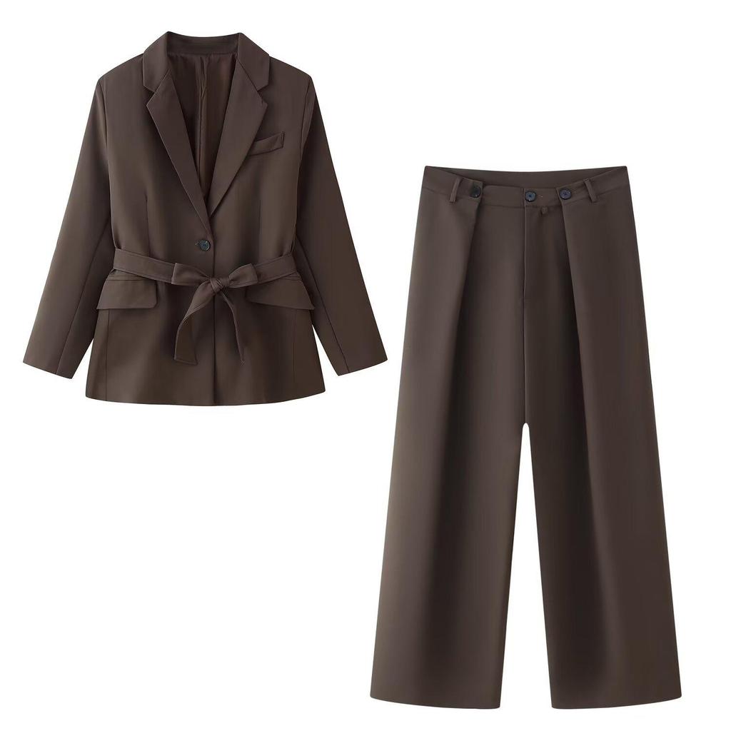 Elevate your wardrobe with this sophisticated women's suit set, perfect for spring 2025. The set includes a stylish belted suit jacket paired with straight-leg pants, offering a sleek and modern silhouette. Crafted from high-quality woven polyester, this ensemble provides comfort and durability. The solid pattern adds a versatile touch, making it suitable for a variety of occasions, from professional settings to social gatherings. With its timeless design, this suit set is a must-have addition for any fashion-forward individual.
