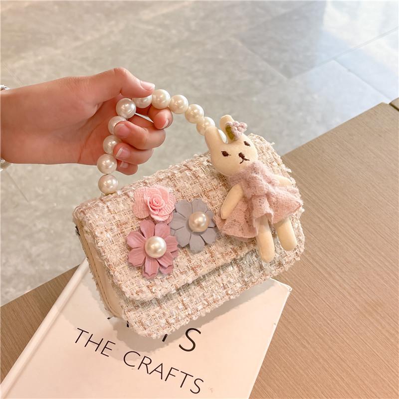 New Girls' Pearl Tweed Handbag: Trendy Little Flower Princess Crossbody Bag