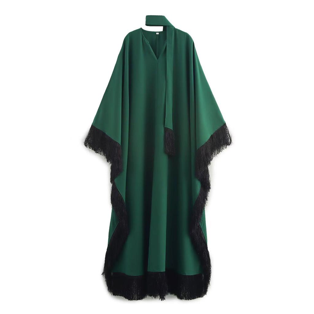 Elevate your wardrobe with this stylish women's dress designed for Spring 2025. Featuring a flowing batwing sleeve design, this long dress offers a comfortable and chic fit. Made entirely from high-quality polyester, it provides a soft, lightweight feel that's perfect for warmer weather. The dress is adorned with elegant tassel details, adding a touch of bohemian flair to its sophisticated silhouette. Ideal for both casual and semi-formal occasions, this dress captures the essence of contemporary fashion with its unique charm and versatility.