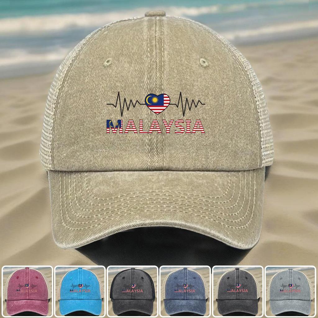 Heart Wave Malaysia Flag Print Snapback Baseball Hat, Patriotic Flat Cap Raw Brim Lightweight Distressed Adjustable Strap Snapback Baseball Cap