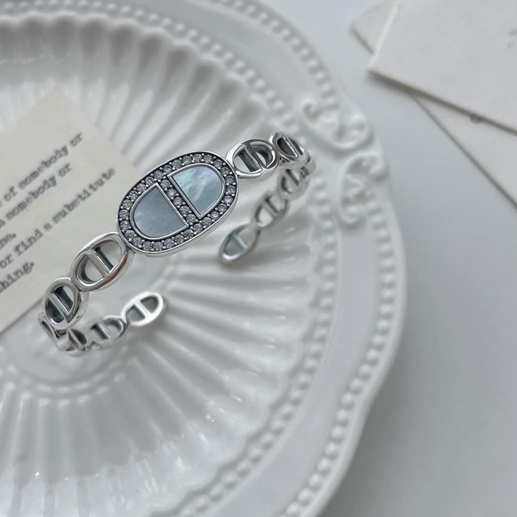 S925 Sterling Silver Korean Style Diamond & Mother-of-Pearl Pig Nose Open Bangle