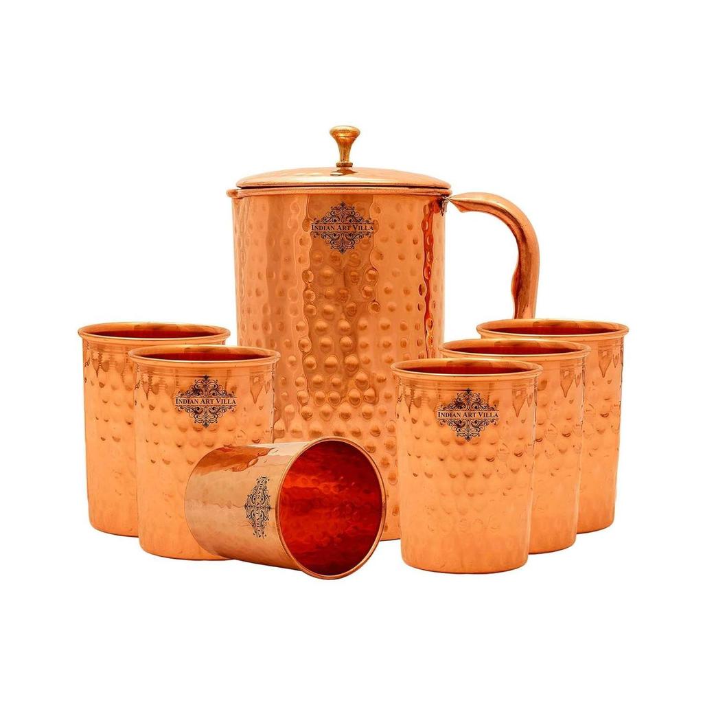 Pure Copper Drinkware Gift Set of 1 Jug & 6 Glass with Gift Box & Hammered Design, Gifting Item for Diwali, Jug-1.5 Litre & Glass-300 ML