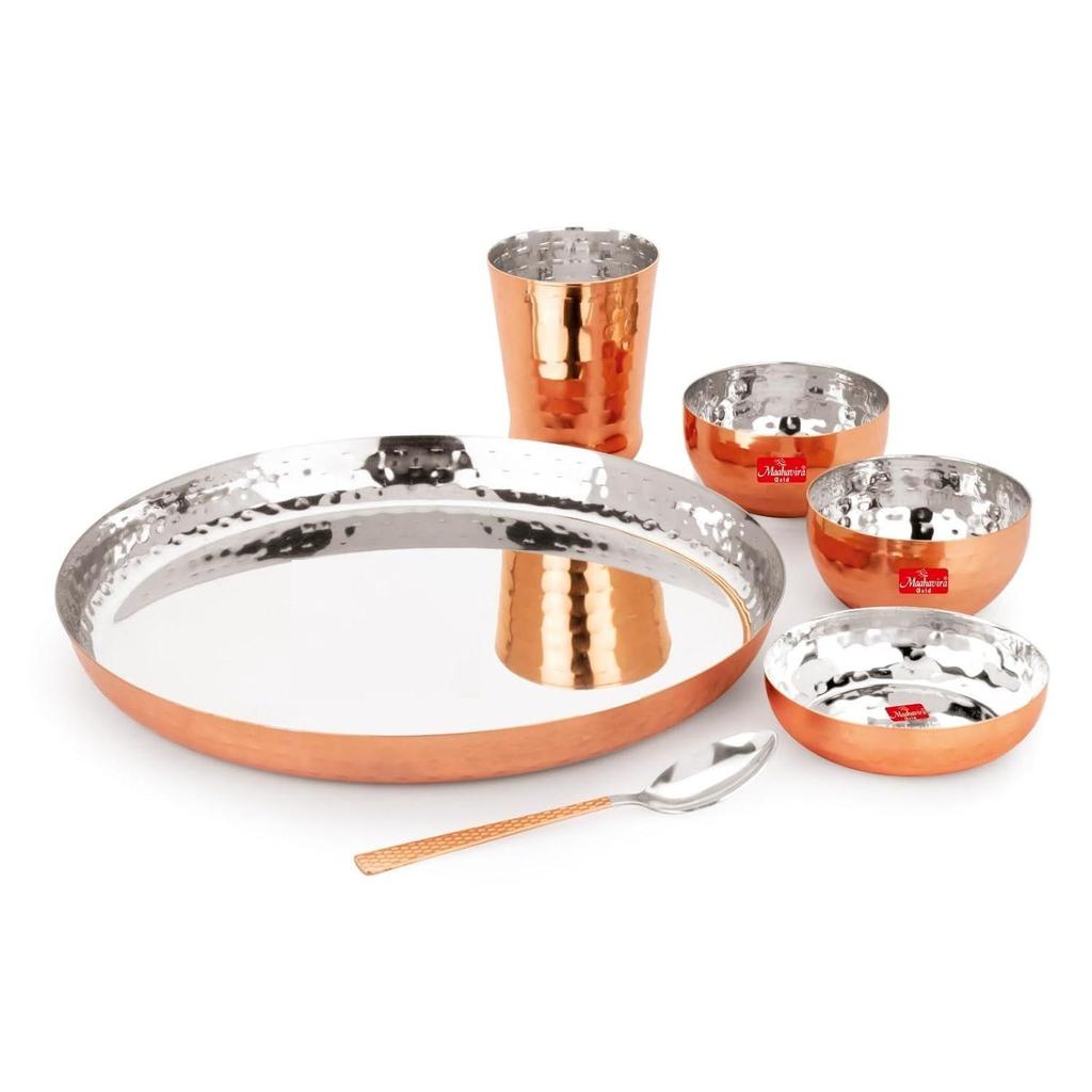 Round Copper Hammered Finish Dinner Sets Used for Home & Restaurant with 1 Thali, 2 Bowls, 1 Sweet Dish, 1 Glass & 1 Spoon-Set of 6
