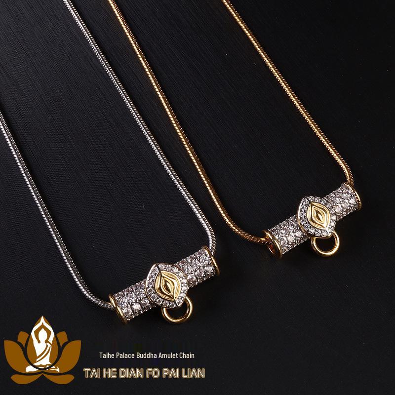 Thai Metal Buddha Amulet Necklace with Titanium Steel Beads, Curved Tubes, Micro-Paved Zircon, Nebula Eye, Butterfly, and Diamond-Set Chain.