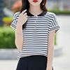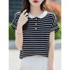 New Summer French Striped Cotton Knitted Short-sleeved T-shirt for Women Loose Niche Design POLO Small Lapel Top