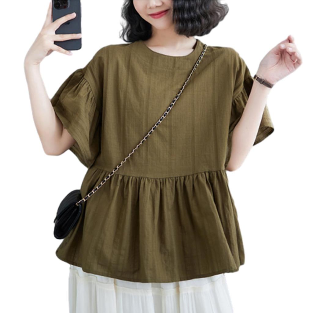Blouses for Short Crew Flared Loose [RoyzTocz] Women, Shirts, Sleeves, Neck, Tops, Sleeves, Ruffles, Plain, Thin, Simple, Plain, Fit, Casual, Tops,